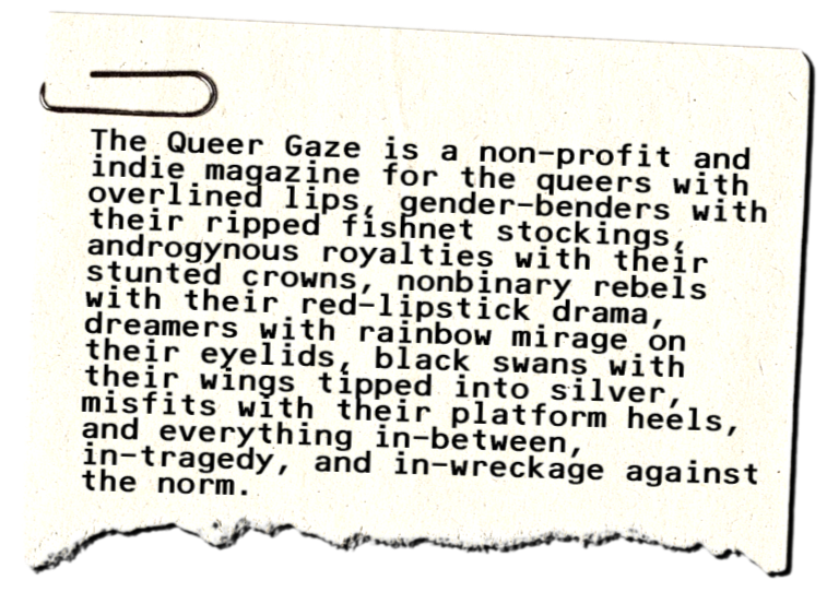 The Queer Gaze is an experimental fusion of the eccentric and eclectic, emblazoning literary sensibility with a forefront telos of innovative storytelling. Based on its name ‘queer’, it splatters a contrast against the irony; it crafts a paradoxical presence of broadening writing into an innovative ubiquitousness. Its gaze is refracted into neon colors, scattering mirrorball effervescence of the saccharine, vicious, dauntless, and vulnerability. It tremors. It seethes with rage and fangs. It tiptoes into an arabesque of nuance. It is rainbowy flamboyance with a wink of mercurial. It is the grind of teeth against shards. The Queer Gaze aims to be magnified in its whole unapologetic queerness and acerbic glam.