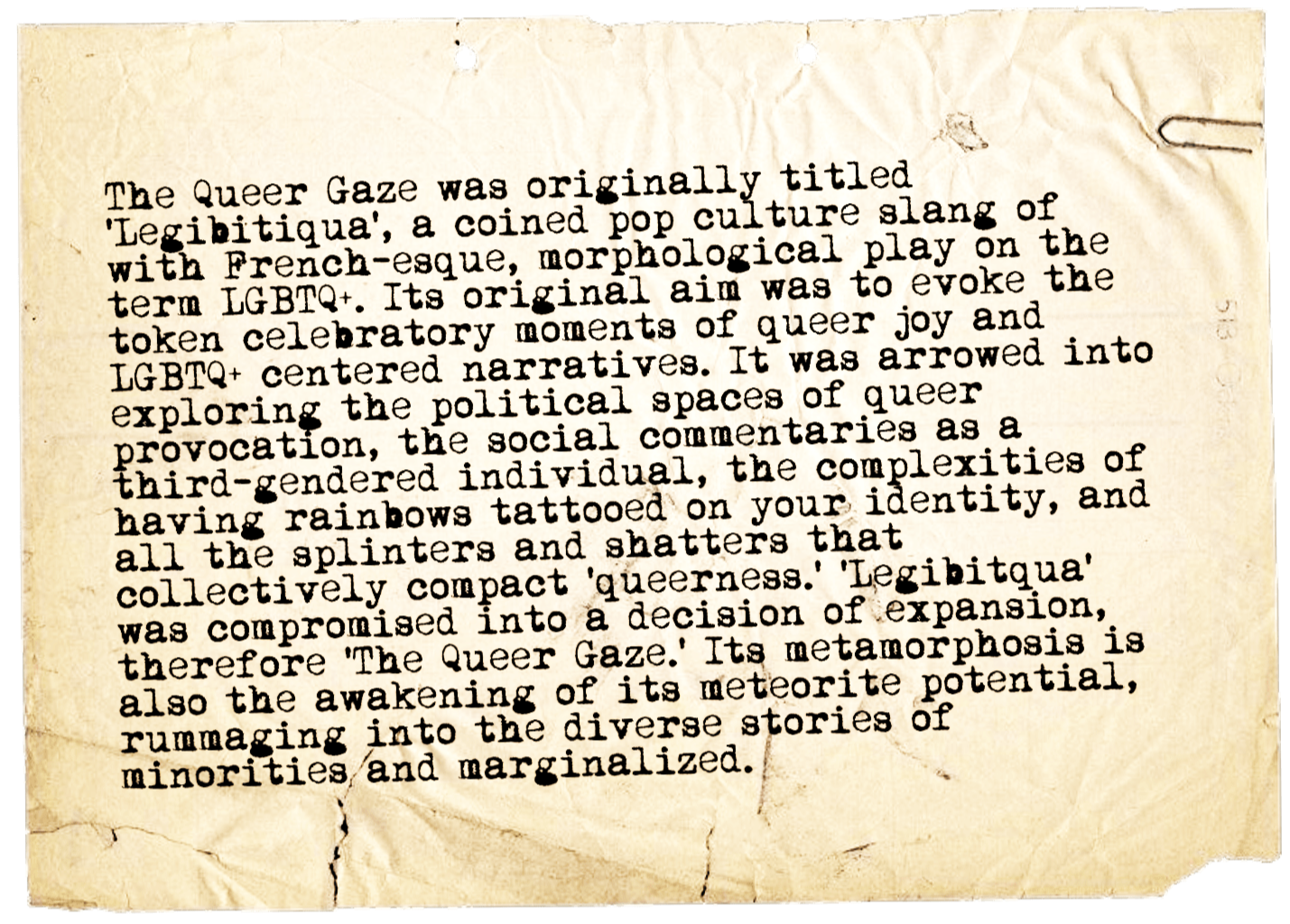 ‘The Queer Gaze’ is a dawning of realization that amidst all the conformity, society still brandishes queerness as something monstrous, and the only way to understand the realm of this experience is looking through the ‘queer gaze'. Our literary magazine aims to exemplify spectral voices, the all-encompassing aspects of inclusivity, and the nodal of stories waiting to sprout from their dormancy. It is a punk-frankenstein that has a surging heart for binary disruption, redefining what it means to be queer. It surges to amplify empowerment, yanking the robust literary existence from minor communities and marginalized spaces. Inspired from trailblazing theories of gender and identity, The Queer Gaze aspires to be a ferocious shrapnel against barricades of oppression. It is a glitter-spiked voice for the underrepresented. It is a quiver of individuality. It is a seismic force for revolutionary dialogues.